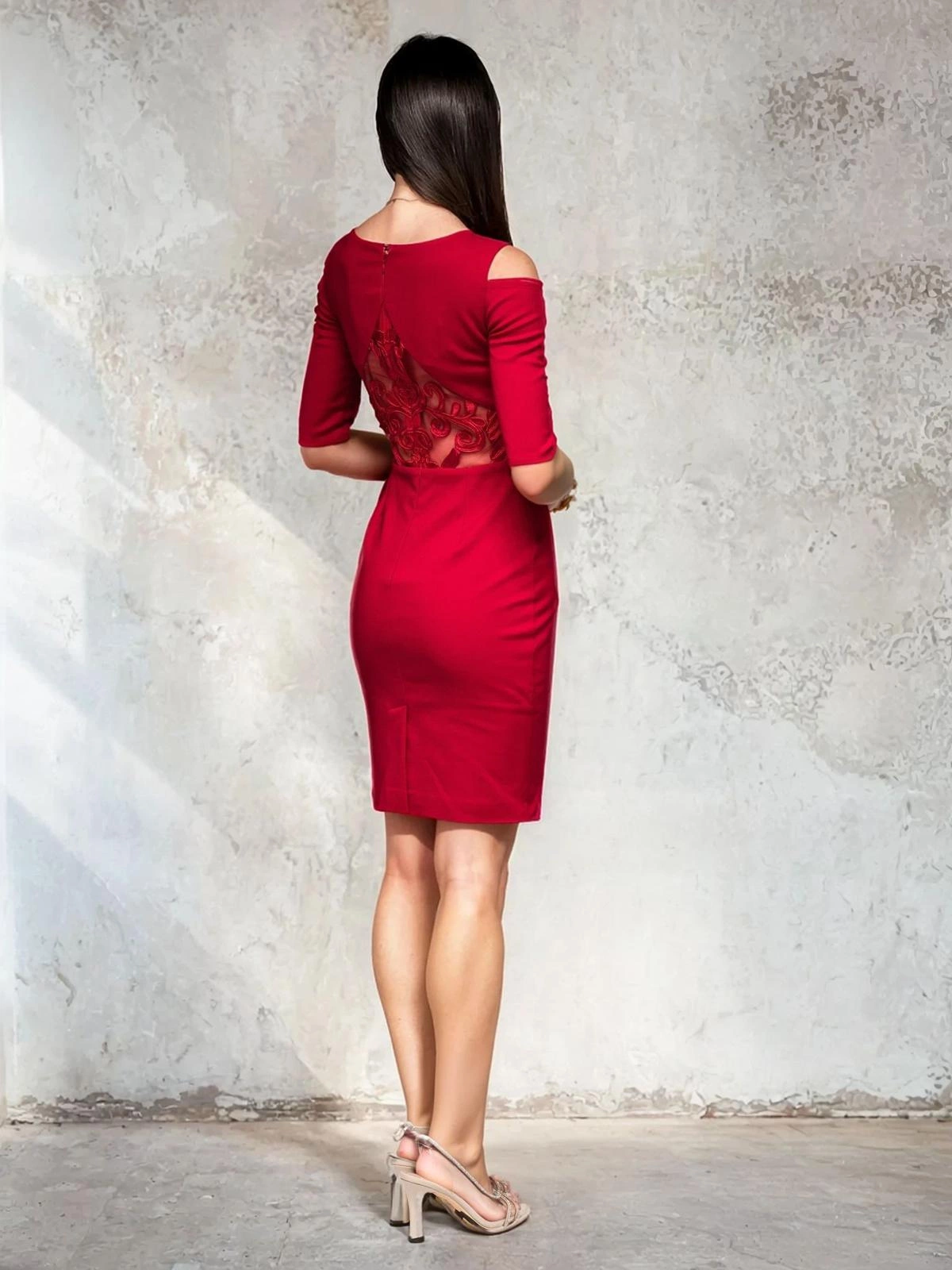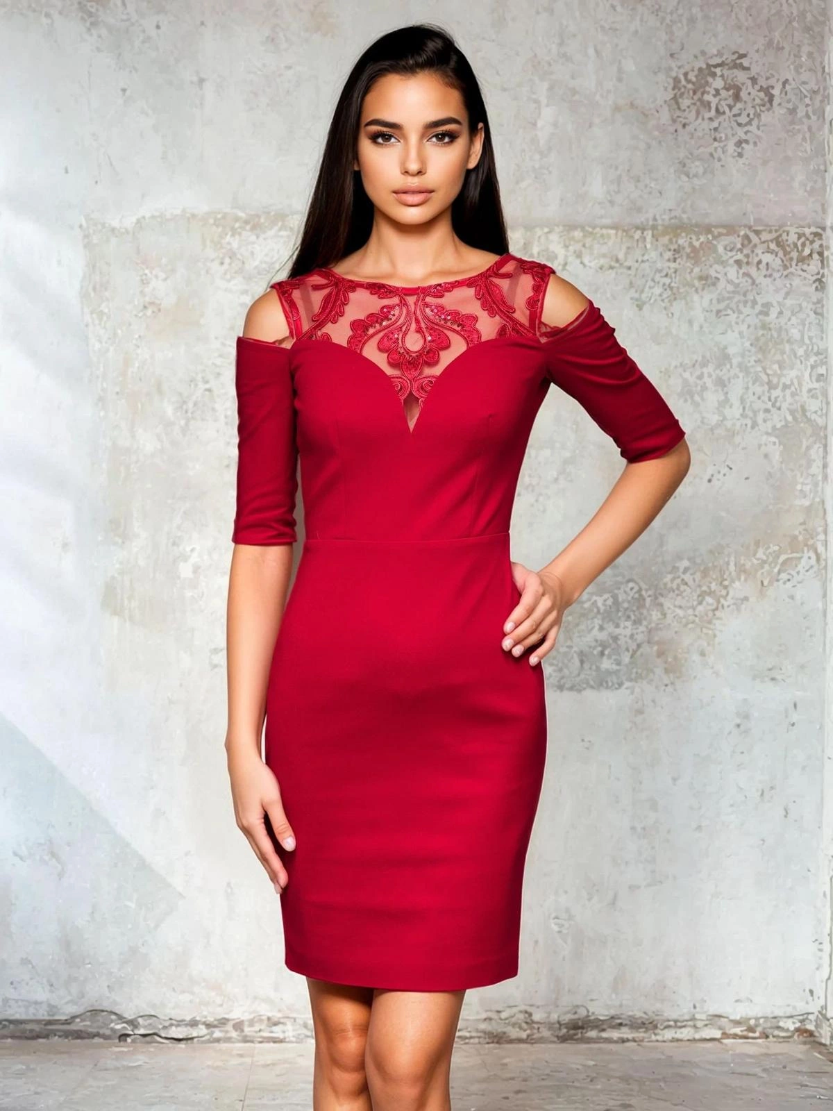Tyto nápadné dámské mini šaty jsou návrhem, který zaujme svou elegancí a ženskostí. Ozdobný kulatý výstřih s krajkovými vsadkami jemně zvýrazňuje linii ramen a dodává celým šatům jedinečně elegantní vzhled. Šaty jsou vyrobeny z látky příjemné na dotek, která zaručuje pohodlí a dokonalé přizpůsobení siluetě. Skvěle se hodí na svatbu, rande nebo večerní akci, kdy chcete vypadat elegantně a smyslně. Jedná se o klasický střih, který snadno sladíte s jemnými jehlovými podpatky a elegantními šperky.